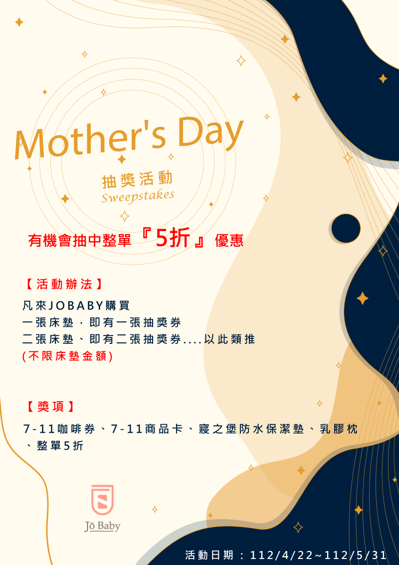 來JOBABY買床除了享母親節優惠折扣與滿額贈以外 『5折』 還可以抽整單『5折』 『5折』 【活動日期】 : 112/4/22~112/5/31 (凡這段時間下單購床都算) 【活動辦法】凡來JOBABY購買、一張床墊,即有一張抽獎券、二張墊、即有二張抽獎券….以此類推 (不限床墊金額) 【獎項】7-11咖啡券、7-11 50元商品卡、寢之堡防水保潔墊、乳膠枕、整單5折 【抽獎時間】本活動將於:6月份抽出”幸運得主” ,確切日期,請關注我們粉專
